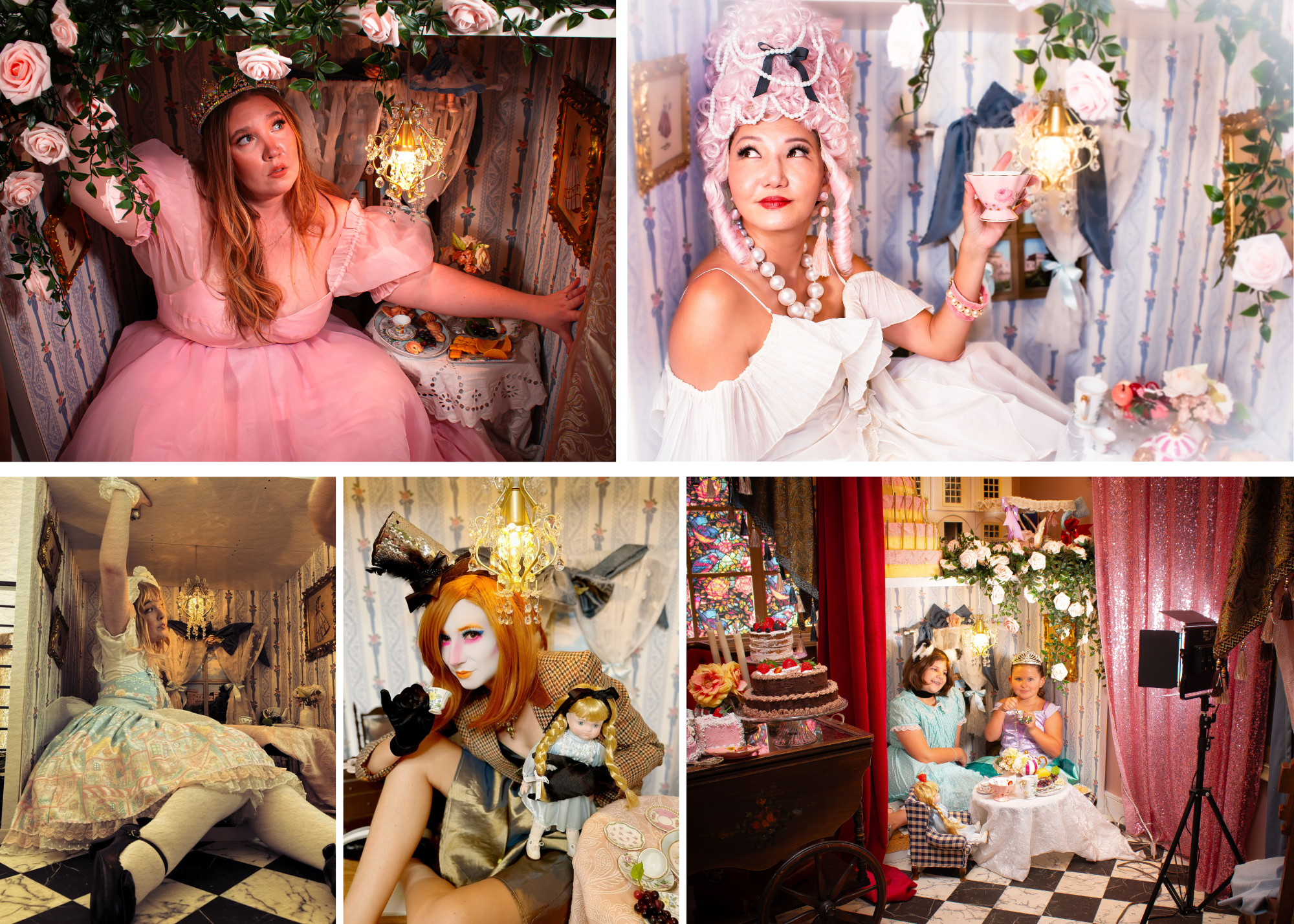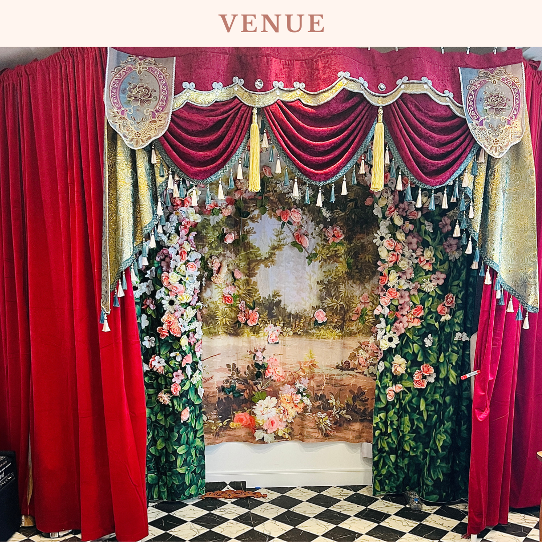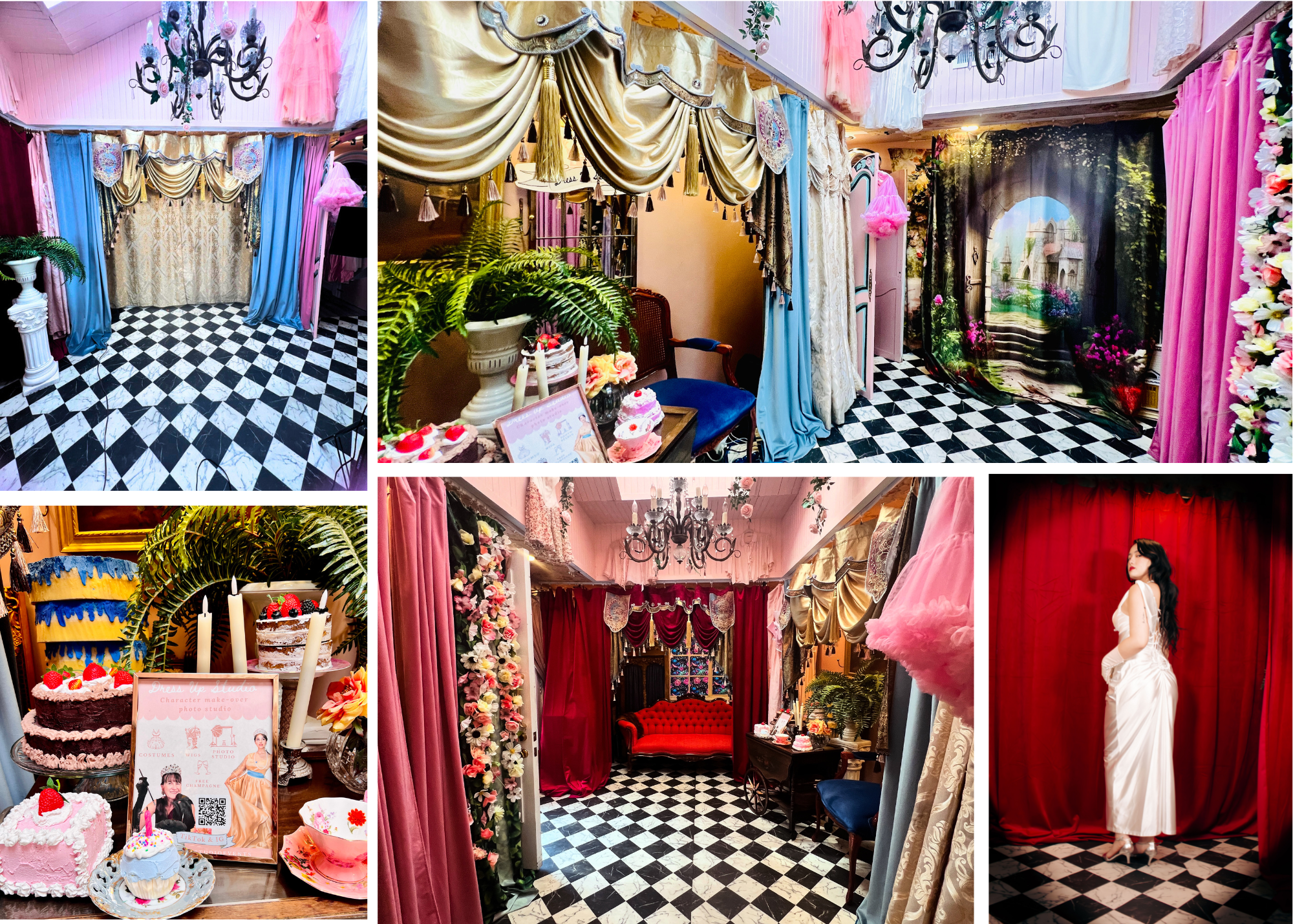 Our unique studio (boudoir red room, pink princess room, Alice in Wonderland Shadow Box, Bridgerton set, interior castle set, Narnia-style Wardrobe, brick wall, and many sliding backdrops