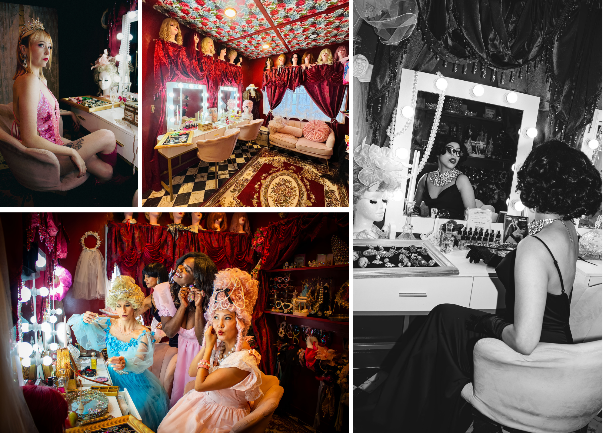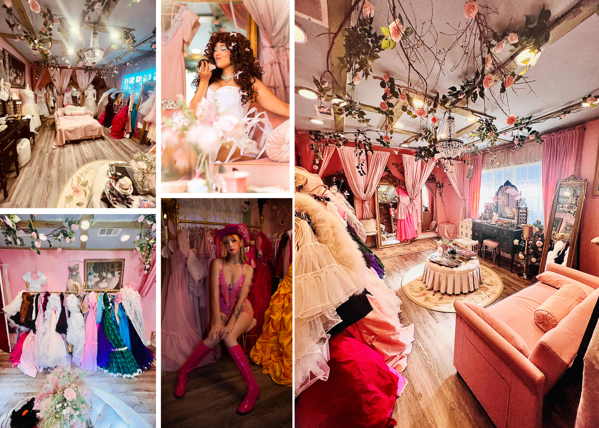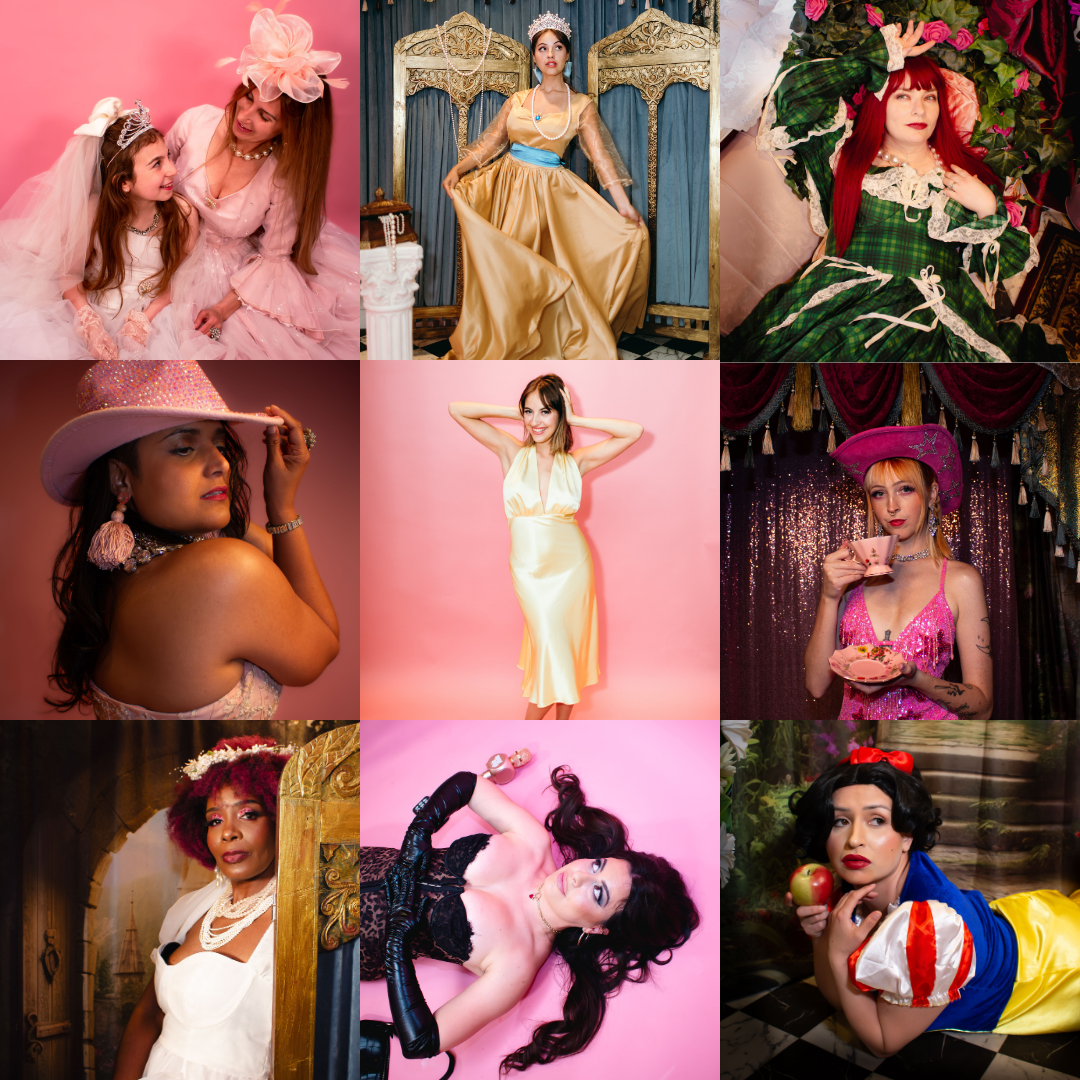 Our unique studio (boudoir red room, pink princess room, Alice in Wonderland Shadow Box, Bridgerton set, interior castle set, Narnia-style Wardrobe, brick wall, and many sliding backdrops